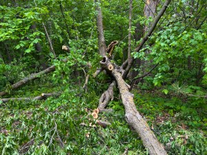 We had two primary goals in mind when we plotted a strategy for what we would focus our efforts on yesterday. The first was something I hoped wouldn’t take a lot of time to accomplish. There were two tipped trees with upper branches hung up in surrounding trees. Using knowledge gained by watching the tree professionals who worked for us last spring bring down similar “widow-makers,” I readied our chainsaw and headed into the woods.