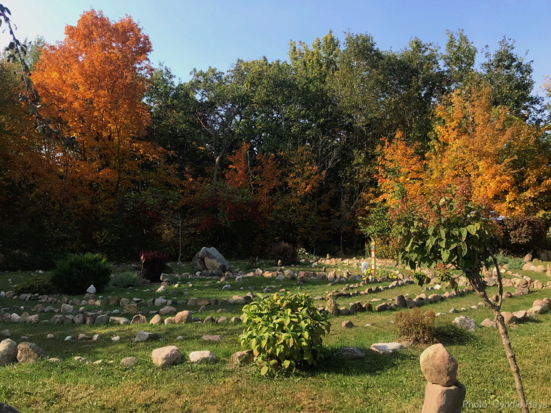 Wandering down the backyard hill toward the opening to the labyrinth, the leaves are still primarily green. Beyond that, there are brilliant splashes of gold, orange, and red showing up with surprising speed.