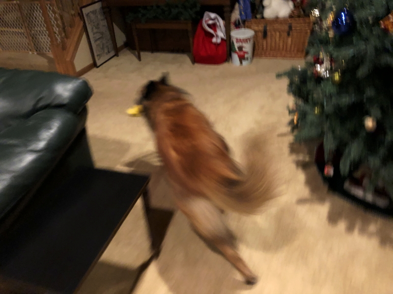 Last night Delilah showed me she had an idea of how to get some exercise indoors while we are staying in the suburbs. First, she brought me her oft preferred squeaking yellow monkey for a little game of tug-of-war.