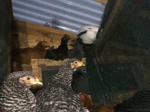 Cyndie headed down to close the chicken coop after a phone call and found darkness almost got there first. All the birds were snugged in place, including two of the young ones who have taken to making the extra leap up to perch on a 2×4 cross-stud over the side window. Silly girls, but not unprecedented because one of the wyandottes from the last batch used to do the same thing. They’ll get over it after growing wide enough that the perch no longer seems wide enough for comfort.