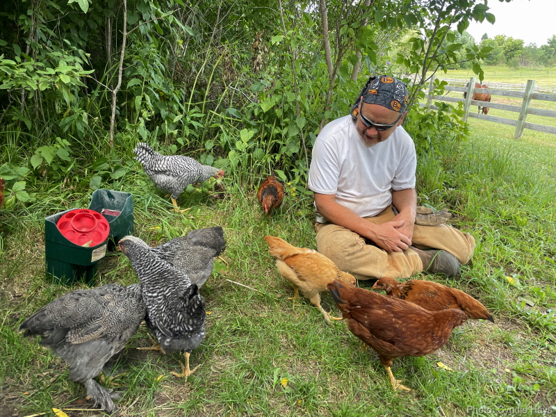After feeding horses and before heading in for our dinner last night, we spent a little time mingling with the chickens as they foraged the shaded grass between their coop and the barn. Cyndie brought out some chicken treats and worked an exercise of calling for them to come to her as she offers to feed them from her hand.