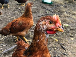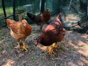 We had asked our animal-sitter to keep the three surviving pullets shut in the coop until we returned after the weekend so she wouldn’t have to fret over their vulnerability.