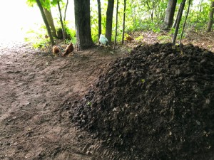 As I shaped the three compost piles yesterday to maximize the processing, it occurred to me that my control over the piles was about to end. From past experience, I know that the chickens are able to destroy the structures I build up faster than I can maintain them.