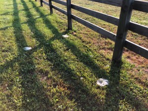 As I was cleaning up three days of manure in the paddocks, I spoke out loud to myself when I spotted the distinct feather markings of Buffalo Bill. It looked like he didn’t give in without covering a bit of distance.