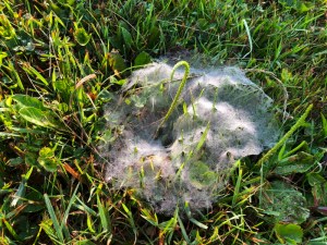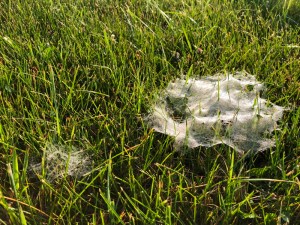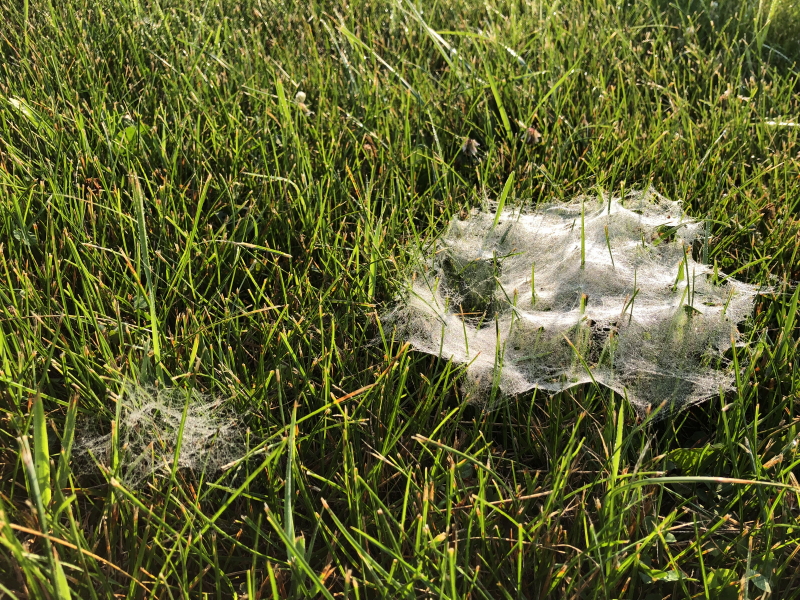 Was there a recent hatch? This wasn’t a normal everyday sight in our experience. These little funnel webs, likely the work of a grass spider, each are the work of separate spiders.