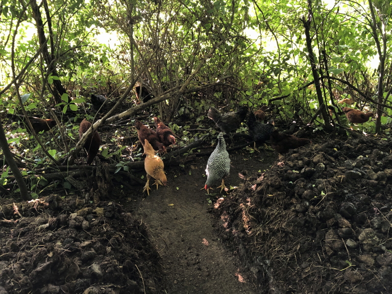 They must be almost overwhelmed with such an amazing amount of choices for their scavenging compared to the scoured and cracking dry dirt that remains in their fenced courtyard space around the coop now. They look almost confused over whether they should nibble on the green leaves at head height everywhere around them or scratch the ground and hunt for movement or just chomp on the clouds of flying insects hovering around manure.