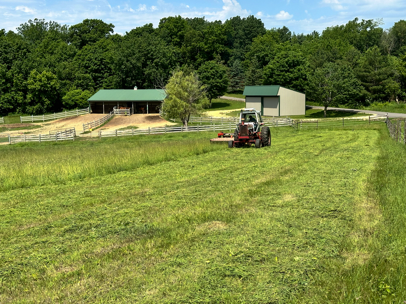 The highlight sight when we reached our driveway was the view of our fields freshly cut and dotted with multiple round bales of hay. We’d gone from telling our renter that the fields wouldn’t be available because we planned to let the horses graze them, to asking him to do us the favor of cutting them because the horses didn’t eat as much grass as anticipated.