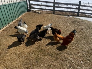 We are down five hens, leaving eight survivors and Rocky. There is no way of knowing what our new rooster may have achieved during the fracas, but one version is that he saved eight. In fact, it’s possible he kept the Buff from being killed and carried away, which is interesting to contemplate since he was usually busy trying to excommunicate her from the group whenever possible.