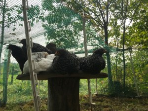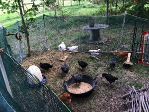 The pullets and Rocky are still confined to a fenced courtyard attached to the coop, but the big girls –a buff orpington, an australorpe, and a wyandotte– wander the property freely.