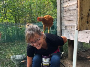 Tuesday night, Cyndie was crawling in the dirt and chicken shit underneath the coop to wrangle chickens back into the coop after their second day romping in their fenced front yard.