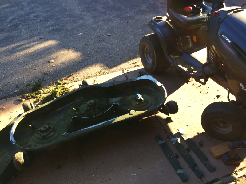 It also gave me a good view of the poor condition of the mower blades. I’m afraid the amount of rocks and sticks I hit this year while learning to steer with two levers has shortened the life of the blades considerably. I don’t feel bad about it. I knew what I’d gotten myself into and consider it a cost for not getting the driveway shoulders finished yet.