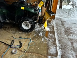 I have to admit, the last two years have lulled me into an uncharacteristic lackadaisical attitude about my techniques of managing the cold and snow. Case in point, that dang plow blade on the Grizzly. It took me three tries to get the mechanisms of the winch-lift and the catch-pin of the blade angle connected so they wouldn’t interfere with each other.