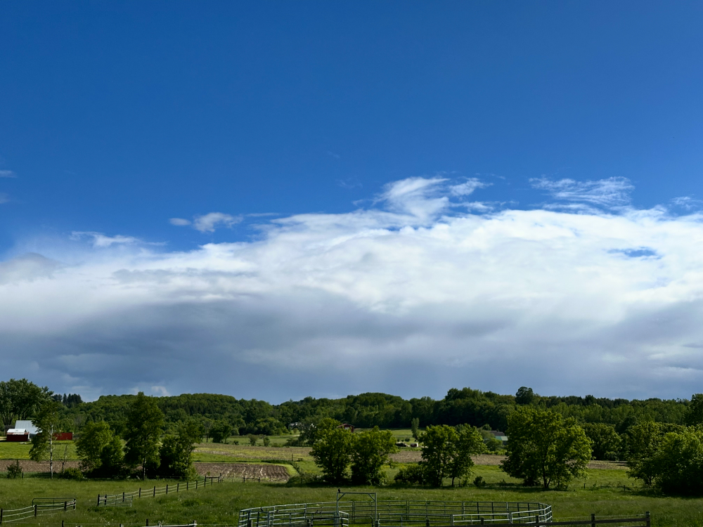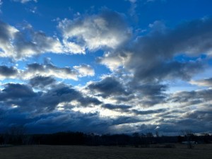 When we emerged from the woods yesterday morning, the cloudy sky was particularly fascinating with a dramatic swirl directly overhead. I knew a photo wouldn’t capture the full essence of what our eyes were perceiving, but snapped a shot anyway.