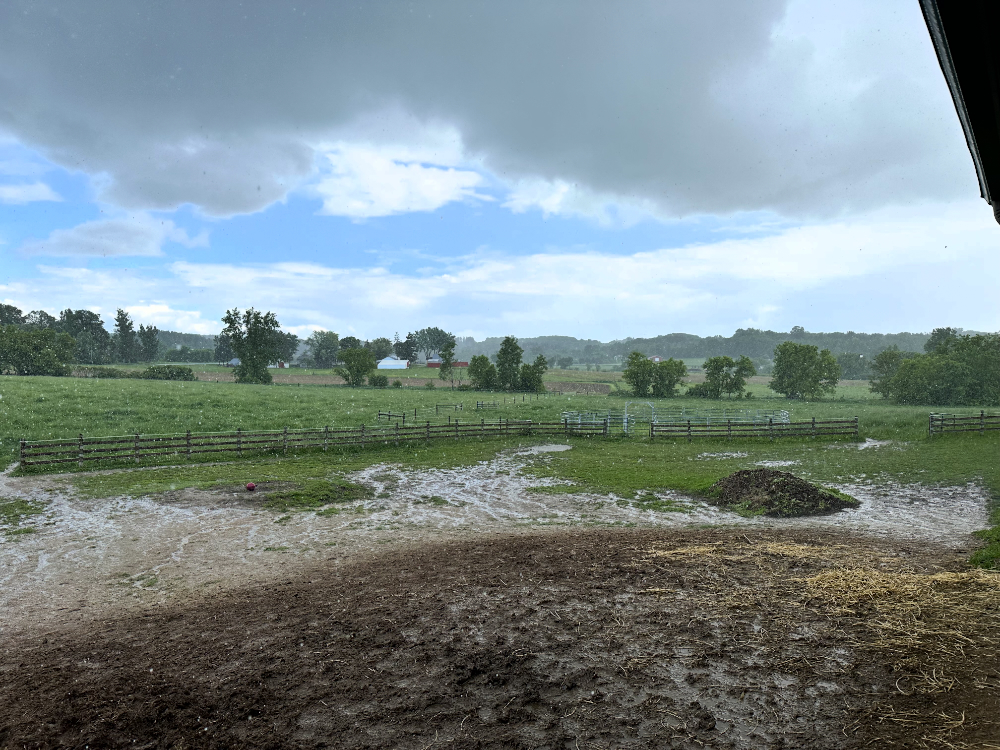 In the seconds after serving the horses their grain, the cloud drops its contents in a soaking downpour.