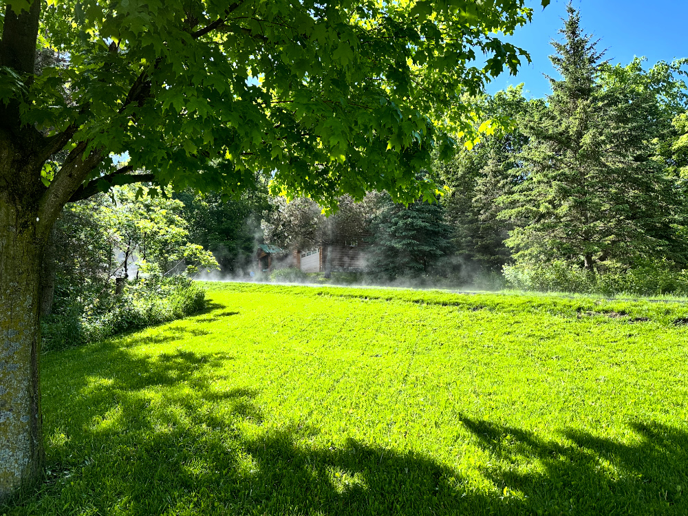 As soon as the ground is sufficiently saturated, the rain ends and sunshine returns to evaporate the water in steaming clouds off the asphalt driveway.