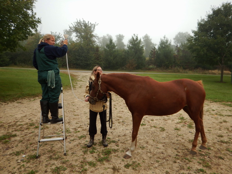 She didn’t appear to be in pain but she definitely wasn’t feeling right. She laid down and rocked on each side, got up and walked a bit, then repeated. I feared she may be experiencing colic. Eventually, she began to cough up and indications aligned more with an instance of choking. I made a phone call to consult with our handler from This Old Horse, Johanne, and we agreed on a plan.