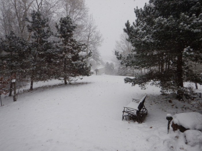 Just in time for Cyndie’s return from Guatemala, 3 or 4 inches of snow have covered up the leaves in the front yard.