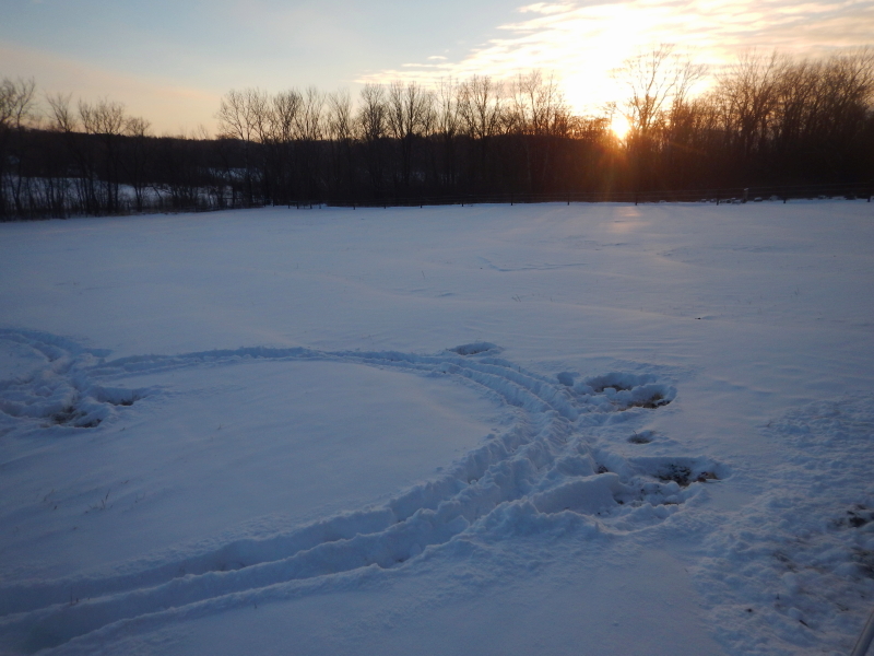 As Delilah and I walked the path around the pasture, I noticed the horses had made cute little circle tracks in the fresh snow, leaving little visible spots of where they foraged grass to graze.