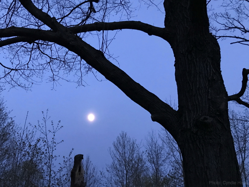 Cyndie pointed out that our new openings around the two big oak trees beside the driveway allow for excellent viewing of the rising moon.
