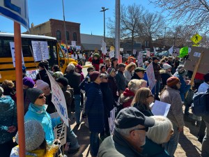 I didn’t know what to expect in terms of numbers but it seemed a little thin at first. We had no difficulty finding a place to park our car. Walking a short distance, we found a line of sign-carrying folks coming down the sidewalk toward us and chanting.