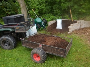 Still attending classes for Master Gardener, Cyndie has already put some of the information gained into practice. Over the weekend, I moved multiple bucket-loads of compost with the big diesel tractor to her newest raspberry patch where Cyndie had laid down a layer of cardboard to block weeds.