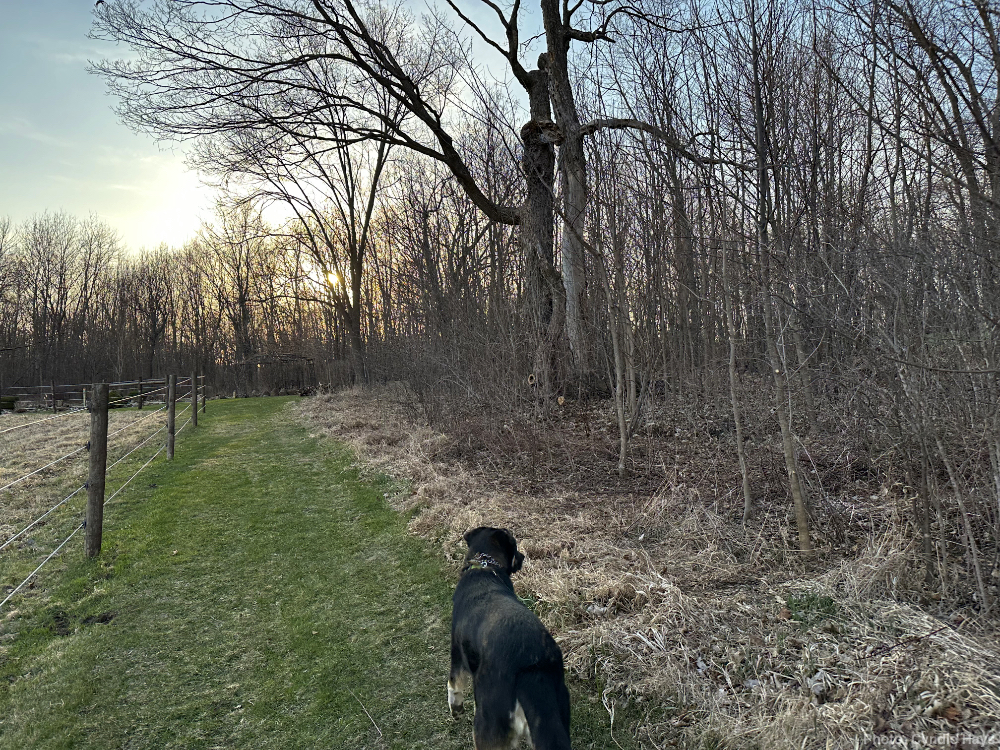 Asher was a very busy guy, scrambling to leave his mark everywhere we walked. I let him romp on the ice for a short distance, and he was thrilled to sprint around on the slippery surface, sliding, turning, and leaping in gleeful doggy fun. It’s too bad that our little ice patch in the paddock at home doesn’t offer him the same opportunity. It would be easier for him to leap over it than slide on it.