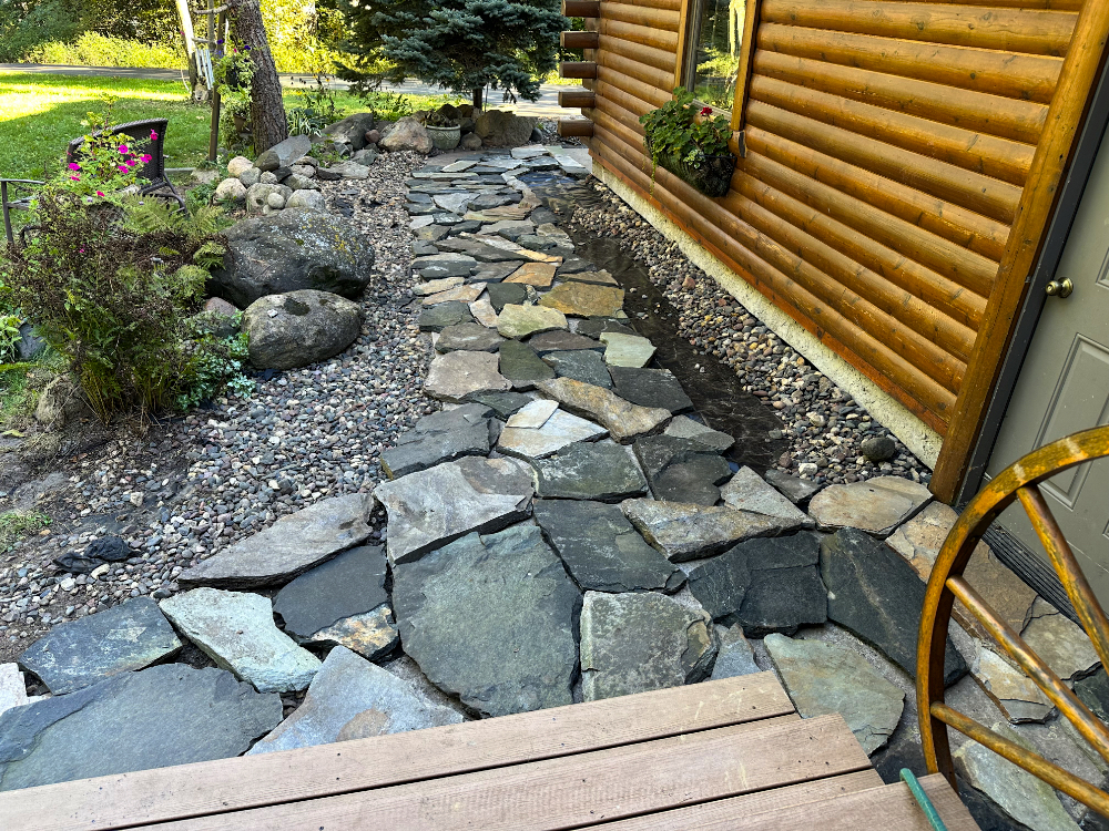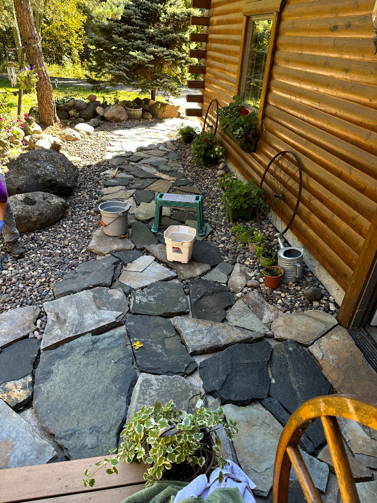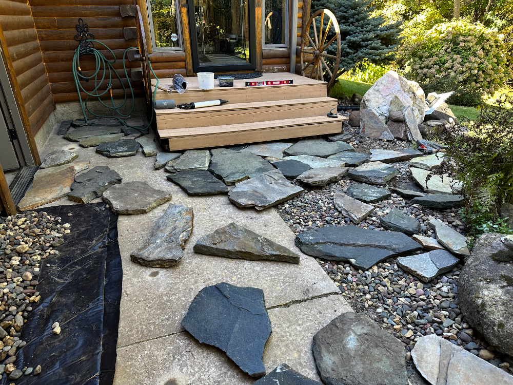 With the concrete slabs returned to their original level with a positive slope away from the foundation, we added some gravel and set about replacing the stone slabs of the rustic entry walkway that won us over when we bought the place.
