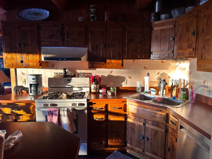 We are done dealing with the smell of micro-leaks of propane from the vintage appliances with no plan to replace them. (I apologize in advance to Thomas, who must cringe at the thought upon reading that sentence.) The small cabin isn’t winterized, and no cooking ever happens there these days. It makes a great overflow space for sleeping in the summer with multiple beds, a full bathroom, a refrigerator, and a kitchen sink.
