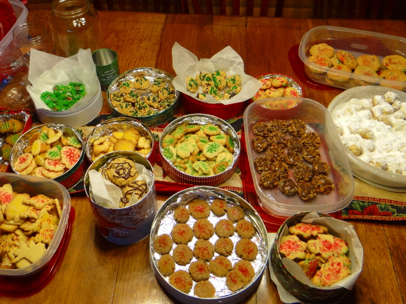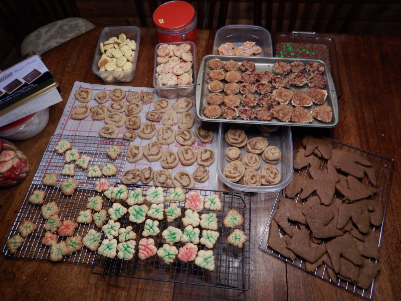 She’s done it again! Cyndie moves like magic in the kitchen when her weekend of Christmas cookie baking arrives. She made a noble dent in the project all by herself on Saturday to start, then, with the help of friends and family yesterday, achieved a record number of total recipes baked when the flour dust finally settled.
