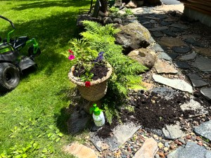 Most of the flowering plants were covered in dirt and smeared across the rocks. I tipped the pot back up, lifted several globs of dirt and plants and placed them back in the pot. Cyndie will never notice.