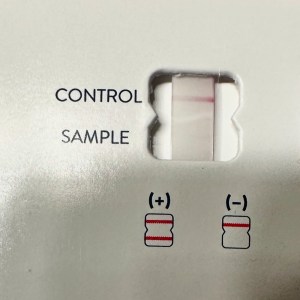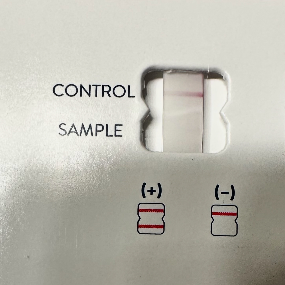 The instructions say to look VERY closely because even the faintest hint of a line should be considered a positive result. There is a faint hint but compared to my other test results that were clearly positive, we take this to indicate the virus is losing its command over me.