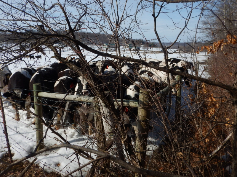 This corner is as far as possible from the barn and feeding area of the neighboring farm and the cows rarely venture out this far, especially through snow. Needless to say, it was surprising to find them there.