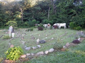 Unsurprisingly, from the top of our back yard hill, we could see the rare sight of white animals down by the labyrinth. By the time we got down there, the shifty cattle were gone again, though not out of earshot. The sound of their navigation through our forest can best be compared to a herd of bulls wandering the aisles of a china shop.