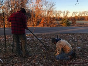 In the afternoon we walked the fence line to look for a reason the electric charge was being loaded down. We discovered a section by the road that appeared to have suffered impact from a vehicle. After several of the seemingly obligatory walks back and forth to the shed for additional parts or tools, we restored the integrity of the wiring to George’s satisfaction.