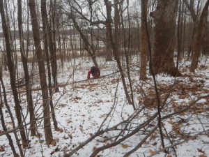 After cutting trees yesterday, we were dragging some of the trimmed branches into the middle of our woods to deal with them.