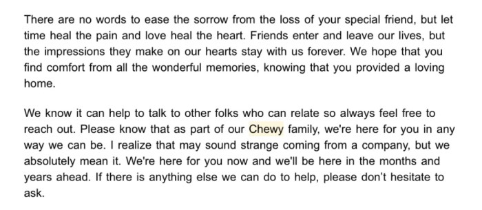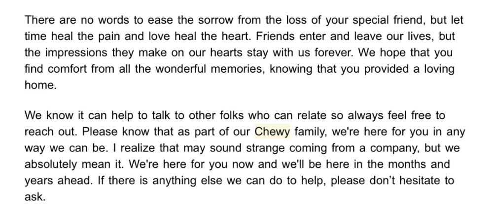 A few days later, we received a delivery of roses from Chewy with further condolences for our loss.