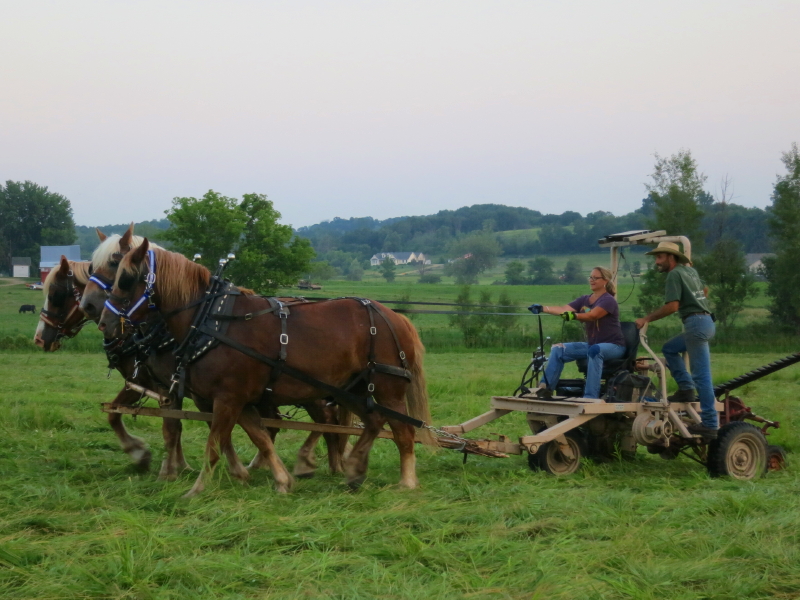 Yesterday, I was sitting in our kitchen, with Delilah at my feet, sprawled out on the cool of the tile, when I heard a new sound coming up the driveway. It was our neighbor from the CSA farm, arriving with a team of horses to cut hay. What a wonderful sight to see. I grabbed my camera and followed them down to the pasture, calling Cyndie on my cell phone as I walked. I knew she would really love to see this, and how much she wanted to learn how to drive his team of horses. She was over an hour away, but I could hear in her voice how interested she was in getting home as quickly as possible.