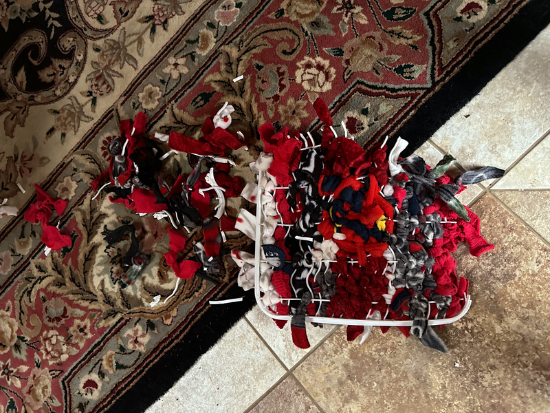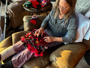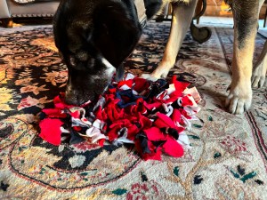 In the afternoon, Cyndie occupied herself in the recliner by making a “snuffle mat” for Asher. My sister, Judy provided inspiration with photos of mats that she makes. The project fit well with the homemade dog chews Cyndie had just sewn for our pup.