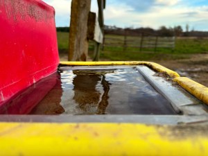 The wind was whipping up some ripples on the surface of the waterer.