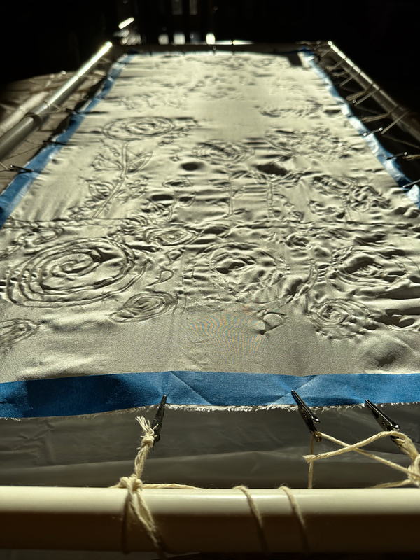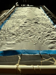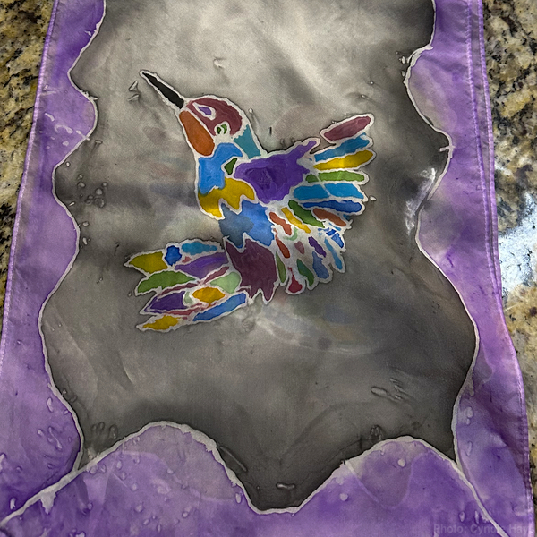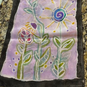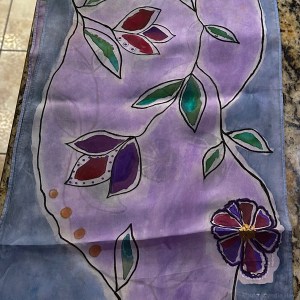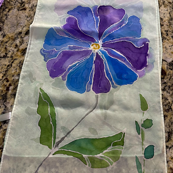 During December, I’ve been enjoying the privilege of a front-row seat for an art project by one of Santa’s loveliest elves. I didn’t even know that painting silk scarves was a thing. Cyndie manufactured a rig to suspend the scarves so she could draw on designs before filling them with wonderful brushed colors.