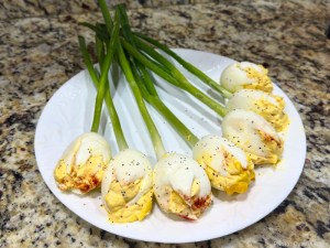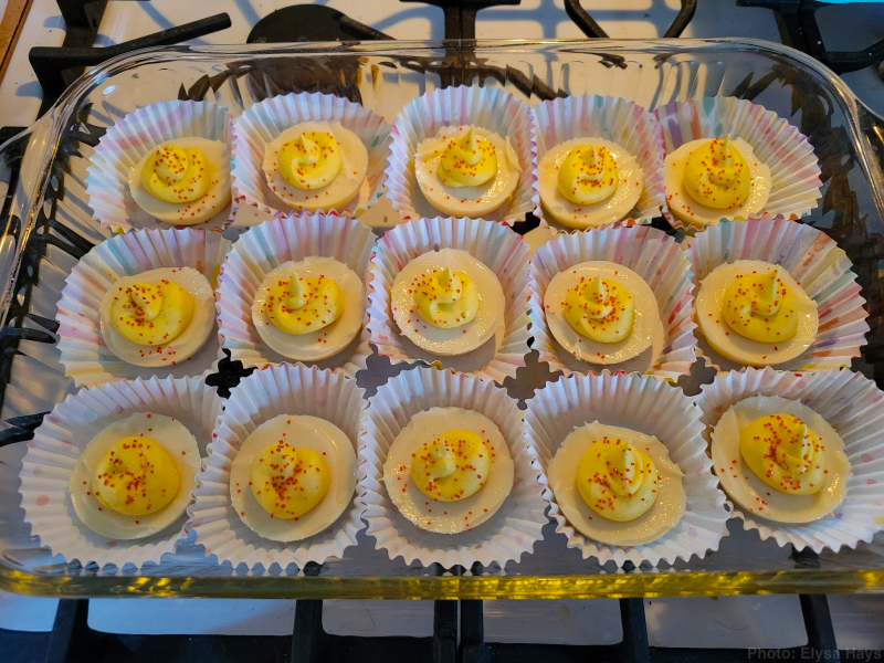 Like mother, like daughter, Cyndie had taken a crack at her own twist on deviled eggs. Neither of them knew what the other was up to. Cyndie decided to prepare her eggs like some she saw in an image online.