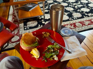 - Egg Bake w/ roasted red peppers, spinach, asparagus, caramelized onions, mushrooms, orange & yellow peppers, and lots of cheese
