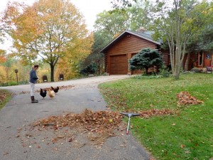 Saturday, while Cyndie was cleaning up the pine needle aftermath left from our removal of another dead pine tree, the three hens showed up to get in on the action.