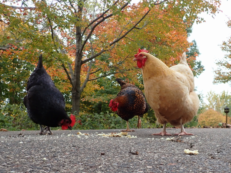 The pullets and Rocky are still confined to a fenced courtyard attached to the coop, but the big girls –a buff orpington, an australorpe, and a wyandotte– wander the property freely.
