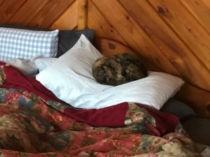In honor of the cat mention included in my poem below, I’m throwing in this bonus picture that Cyndie recently took of Pequenita behaving like royalty on Cyndie’s pillow.