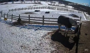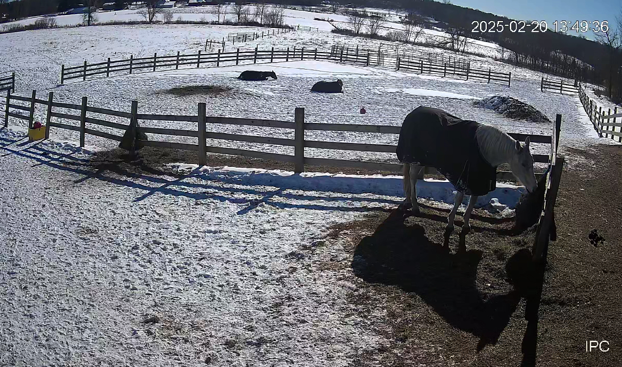 We added a few more degrees for our daytime high temperature yesterday, and it is beginning to feel pleasant for an afternoon stroll. Before Asher and I stepped out for a sunny explore, I was looking in on the horses via the camera and finally spotted Light lying down for a deeper rest.