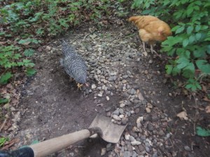 The chickens showed up to help, but were almost too eager to get after the creepy crawling creatures revealed when I scooped a shovel-full. They were more interference than they were helpers, but they sure are cute to have as company.