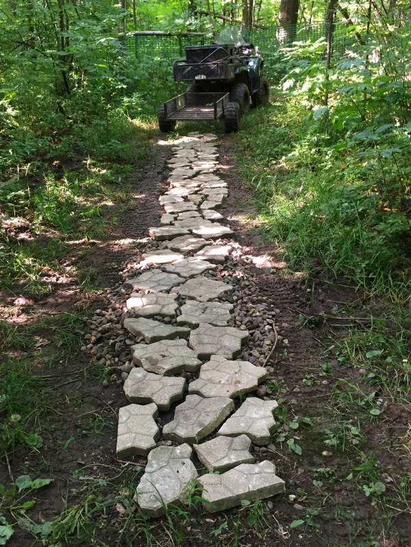 Hoping to minimize the handling, I wanted to transfer from the truck to the ATV trailer so I could deliver pavers directly to the path in the woods.