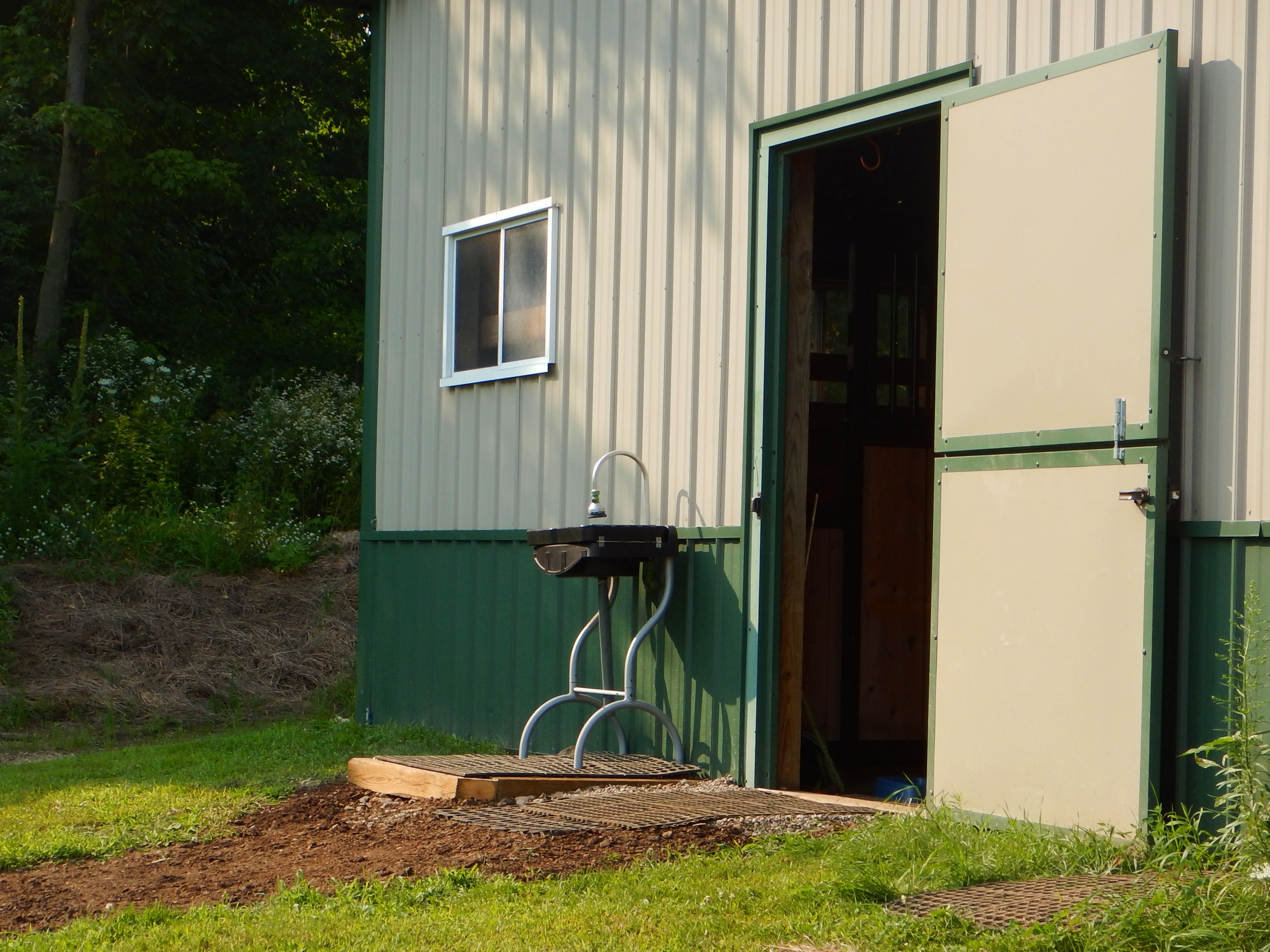 I recently built a platform outside the back door of the barn for Cyndie’s portable sink. She said she liked it, but that she was also hoping to have a work station for washing horses in that area. On Friday, I worked on a design for a way to provide that, just beyond the sink.