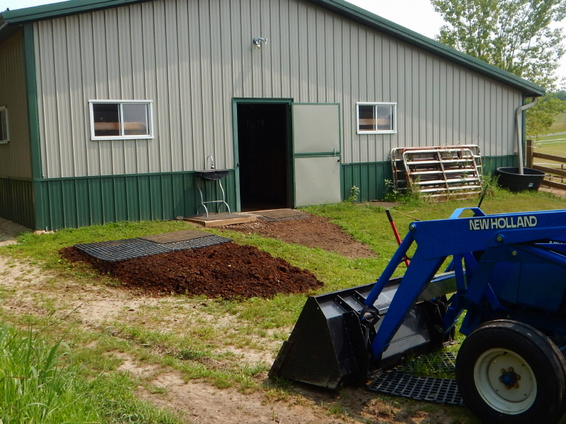 For now, I am using the mostly composted manure from long ago as clean fill around our property. I moved a few bucket-loads to the spot and now have a sense of space that will be needed. I plan to bury a couple of fence posts to make a hitching rail and build up a platform where the horses will stand. We have some plastic grates that interlock, which we will fill with pea-gravel, and then that will be covered by rubber mats. I expect there will be a layer of plastic beneath the pea-gravel to cause water to drain in the direction we want it to go.